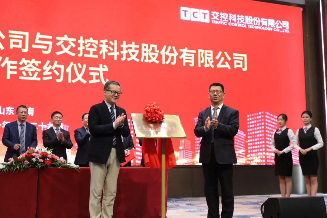 仪式上,丁强和王智宇代表双方签订战略合作协议,陈思斌和郜春海共同为合资公司山东交控科技有限公司揭牌。