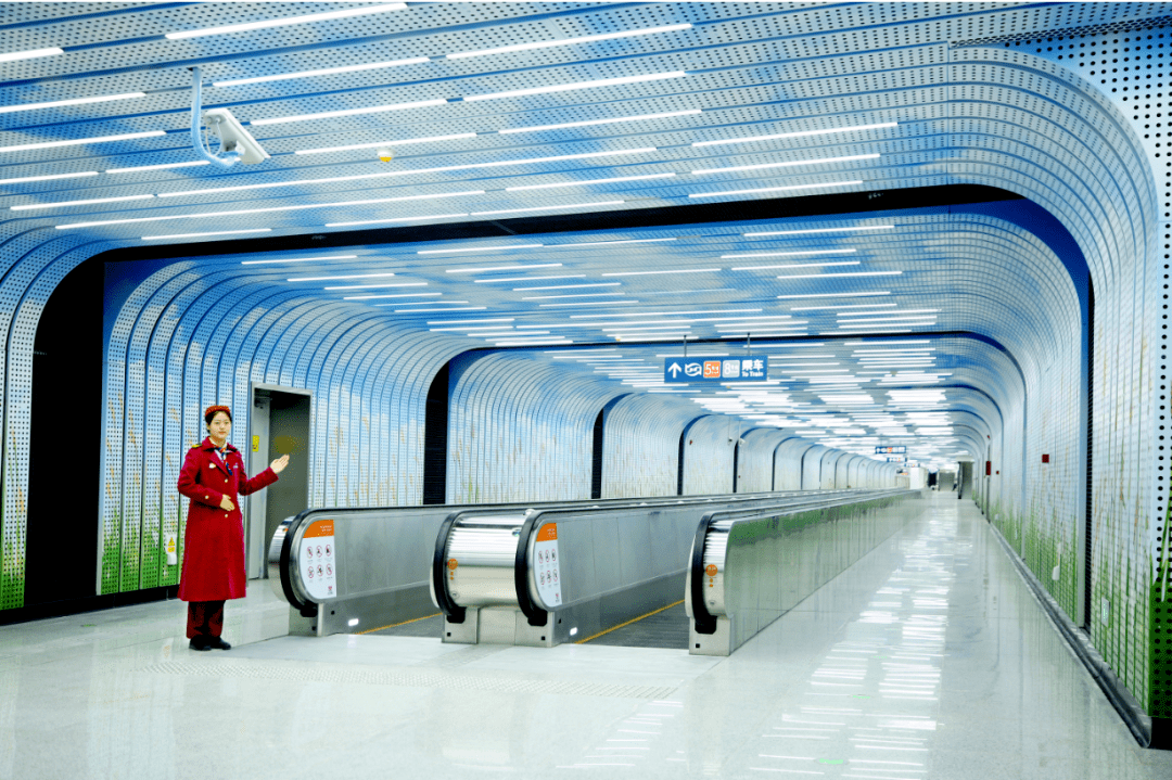 5号线与7号线之间的换乘通道十分浪漫,沿途“芦苇依依”,还设有平行手扶电梯,乘客换乘途中,可以拍照打卡、欣赏壁画。