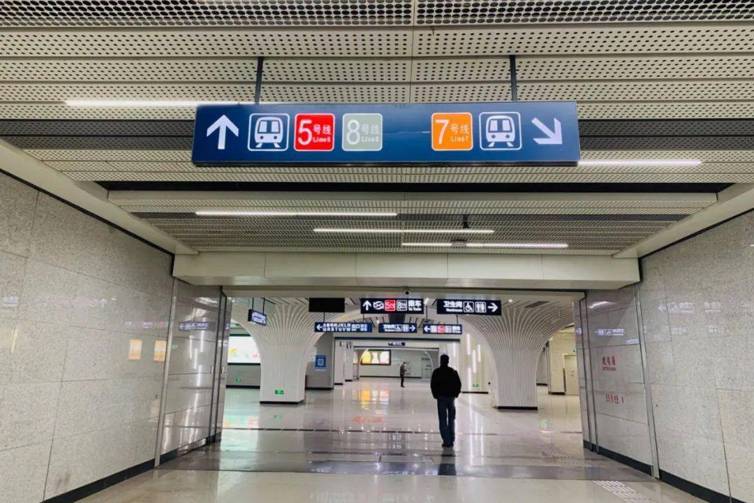 7号线与8号线的换乘需途经5号线。7号线、8号线的站厅均与5号线站厅的换乘通道相连,乘客换乘时需途经5号线站厅、站台换乘通道,两站最短换乘时间约为6分钟。