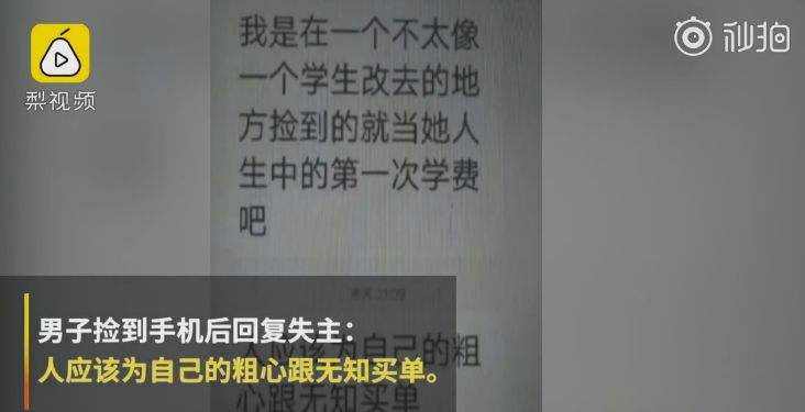 14日,江西省南昌市,女孩手机丢后,妈妈收到捡手机的人的短信,不仅索要屏锁密码,对方还教训称:人应该为自己的粗心跟无知买单。据悉,女孩手机是打工攒钱买的,遗忘在游戏城后被一男子捡走,目前女孩已报警。