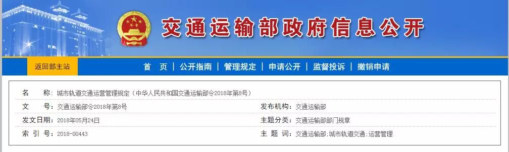 《城市轨道交通运营管理规定》已于2018年5月14日经第7次部务会议通过,现予公布。自2018年7月1日起施行。