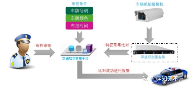 系统通过设置布控条件,经过审核后形成布控单,前端车辆采集的数据(或采集的视频图片经过深度识别服务器进行特征提取),实时与布控信息比对,若比对成功系统自动进行弹出并可联动警号进行提醒,同时可将报警信息发送至对应的警务人员手机,便于快速进行涉案车辆的处理。