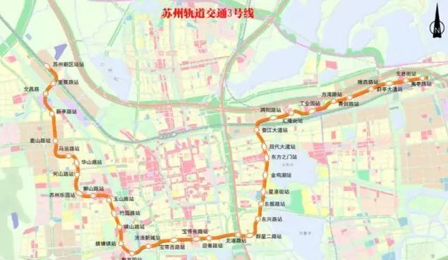 苏州轨道交通3号线起始于苏州新区站,终止于夷亭路站,全长45.2公里,途经苏州高新区、姑苏区、吴中区、苏州工业园区,设站37座,平均站间距1.215公里。