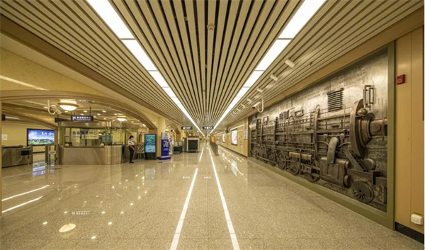 地铁2号线哈尔滨站墙面上的《轮·回》艺术品,以中东铁路时期第一辆火车头(编号205)和新中国成立后第一代“毛泽东号”火车头的造型为设计元素进行创作,背板图像呈现了哈尔滨火车站4次站房改造工程的珍贵图片与文字资料,车辆上斑驳的痕迹犹如一部凝固的城市时间简史,承载了一座城市的百年记忆。