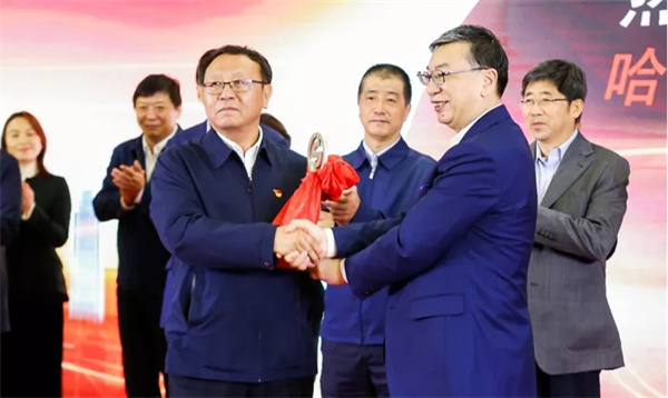 向哈尔滨地铁集团有限公司党委书记宋修日(左)