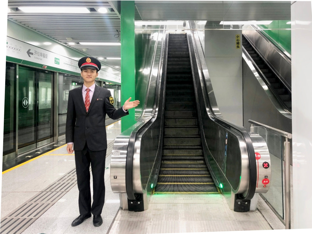 设置在扶梯右侧扶手带旁、超长扶梯的中间隔离带。当发生扶梯故障或者人员跌倒等其他紧急情况时,应及时直接按压紧急停止按钮,同时大声提醒乘客“站稳扶好”,以免由于惯性导致扶梯上的乘客摔倒。