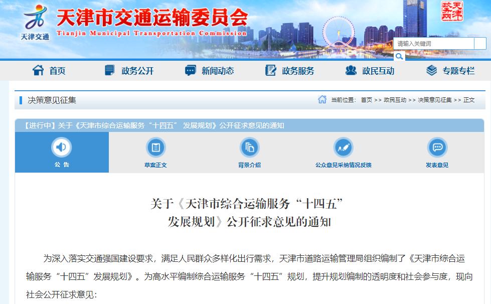 近日,天津市交通运输委网站公布了《天津市综合运输服务“十四五”发展规划》(以下简称《规划》),面向社会公开征求意见。《规划》明确了天津市综合运输服务“十四五”规划的发展目标和重点任务。