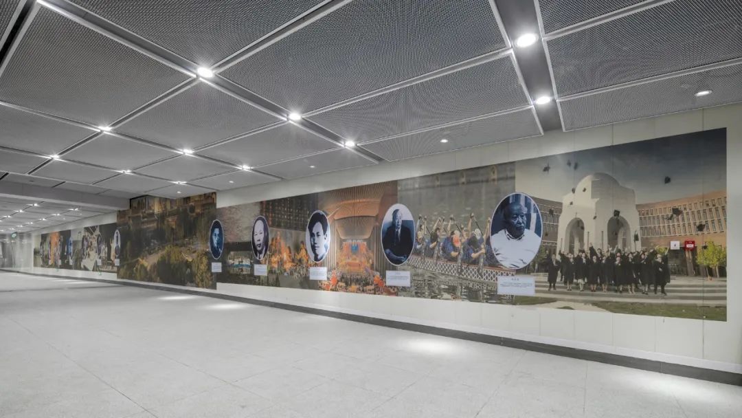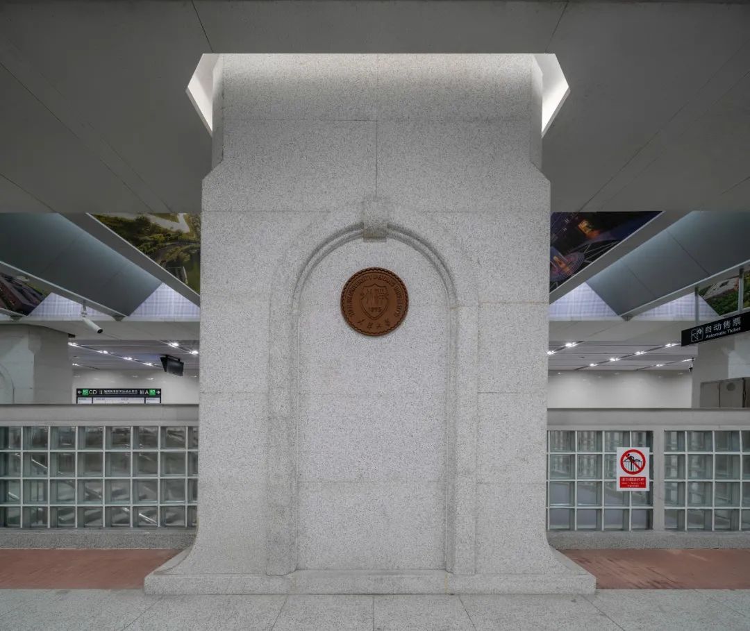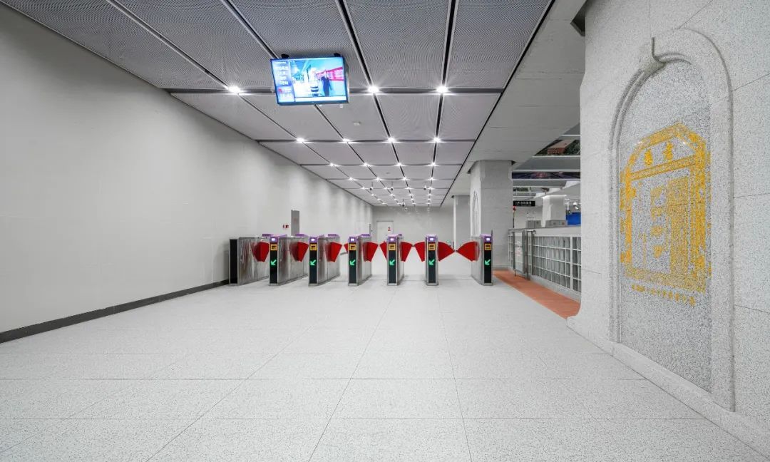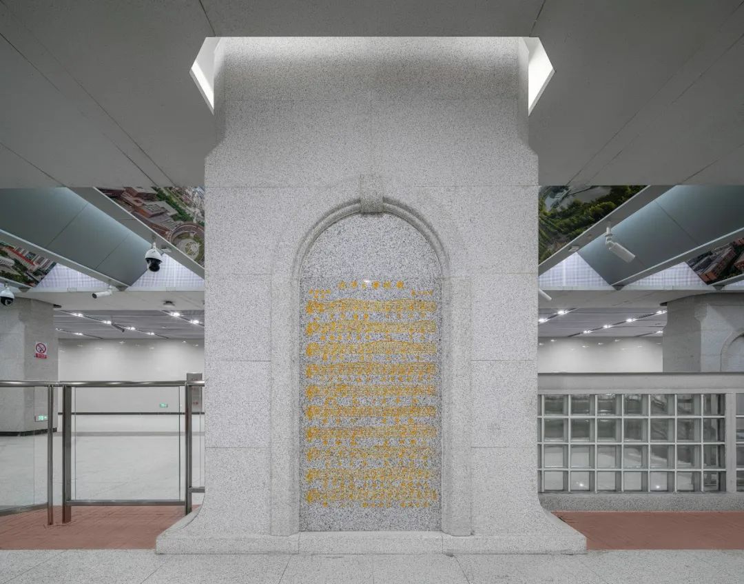 宽敞的站厅旁边一幅天大建筑图占满了整个墙壁