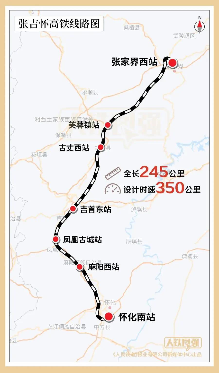张吉怀高铁设张家界西、芙蓉镇、古丈西、吉首东、凤凰古城、麻阳西、怀化南等7座客运车站。开通运营初期,安排开行动车组列车32趟,初期运营时速300公里。