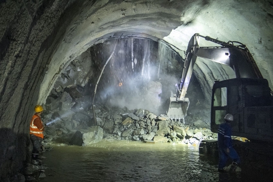 在小相岭隧道施工过程中,每逢涌水,勘察设计人员都要及时“出现场”把脉问诊,拿出治水之策。2020年10月31日,36号横通道出水,坑底面被水淹没约半米,汽车无法通行,刘志威坐在装载机的铲斗里行进了约6公里才到达出水点,进行现场水文地质踏勘,由于平导内坑底凹凸不平,行进期间还差点掉进水里。中铁隧道局九标项目部工程部长何亚涛说,施工期间遇到的大大小小岩溶管道共几十处,现场作业人员穿着雨衣和连体裤在瀑布下开挖作业,青年技术人员则在瀑布下进行严格的质量验收和现场技术指导。