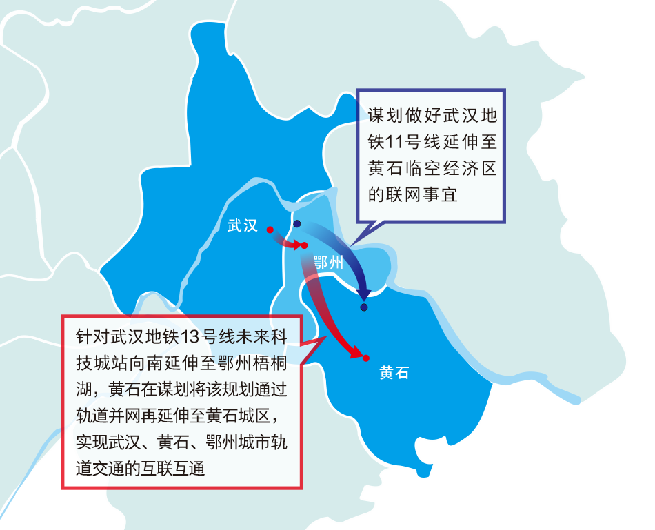黄石市住建局有关负责人介绍,在对接武汉都市圈同城化发展上,黄石正在谋划轨道交通联网,建设对接鄂州花湖机场轨道交通,串联黄石北站、大冶北站,同时谋划做好武汉地铁11号线延伸至黄石临空经济区的联网事宜;针对武汉地铁13号线未来科技城站向南延伸至鄂州梧桐湖,黄石在谋划将该规划通过轨道并网再延伸至黄石城区,实现武汉、黄石、鄂州城市轨道交通的互联互通。