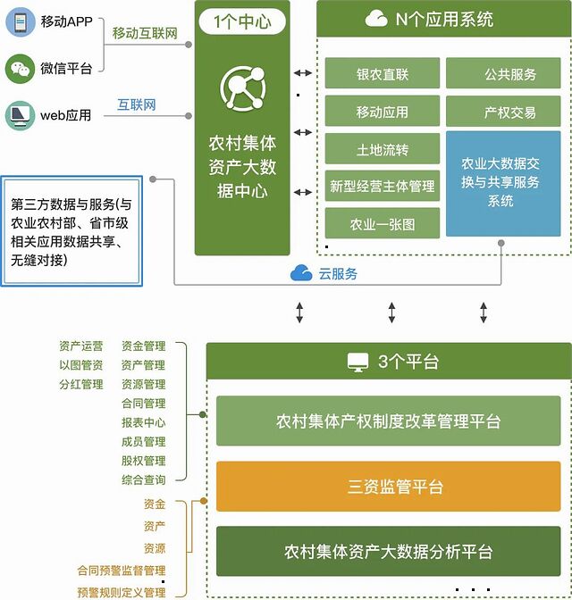 N个应用指银农直联系统、公共服务系统、移动应用系统、产权交易系统、土地流转系统、新型经营主体管理系统、数据交换与共享服务系统、农业一张图系统等,涵盖农村集体产权数据采集、管理、服务、经营一体化应用全过程。