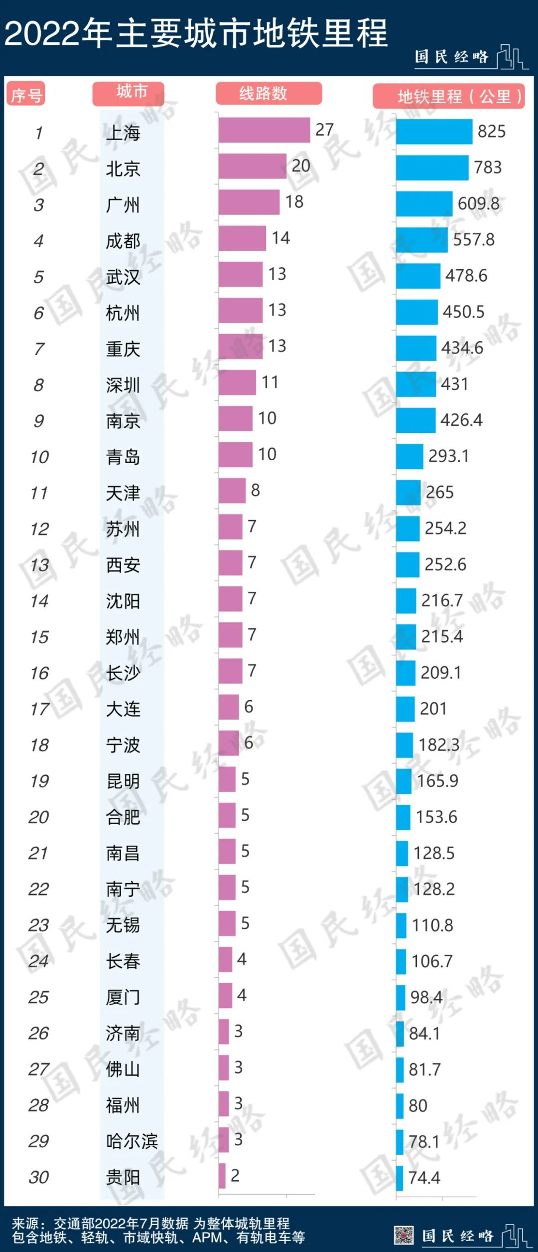 这是2022年上半年我国各地城市轨道交通线路排行: