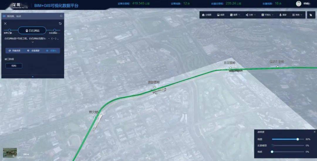 既有线路图纸均基于深圳独立坐标系绘制,为了满足智慧城市统一坐标系的要求,在市规自局的大力协助下,全部转换成2000国家大地坐标系,市政院克服建模工作量增加1.5倍的困难,按国标2000坐标系交付BIM模型。